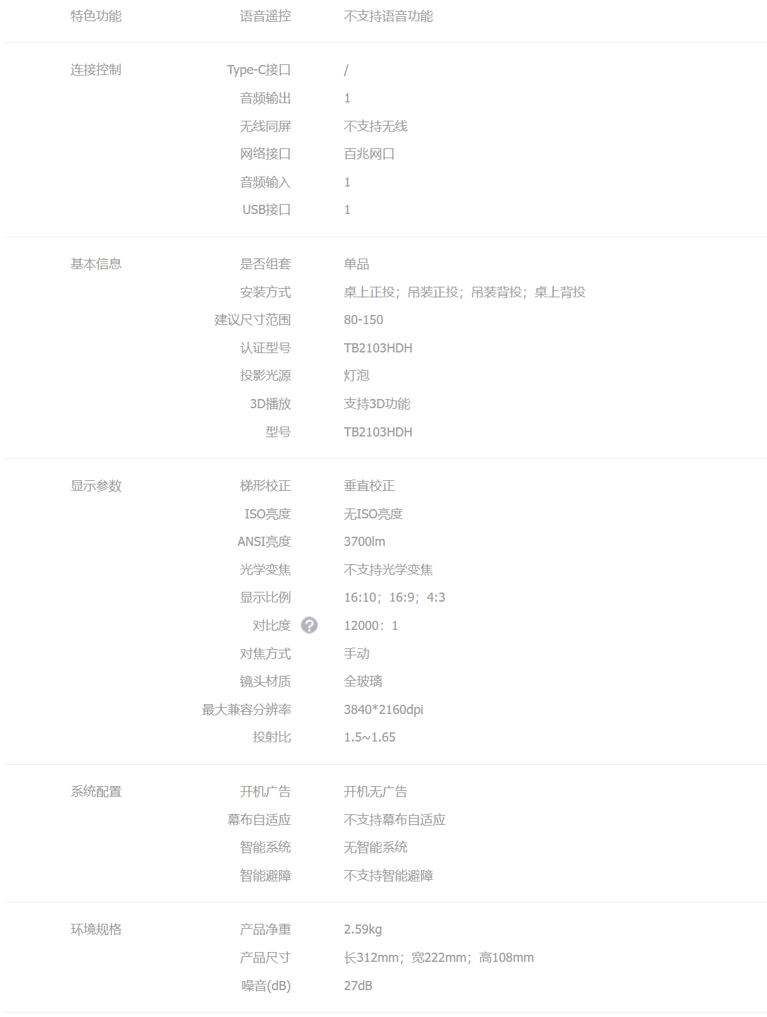 优派 TB2103HDH 投影仪
