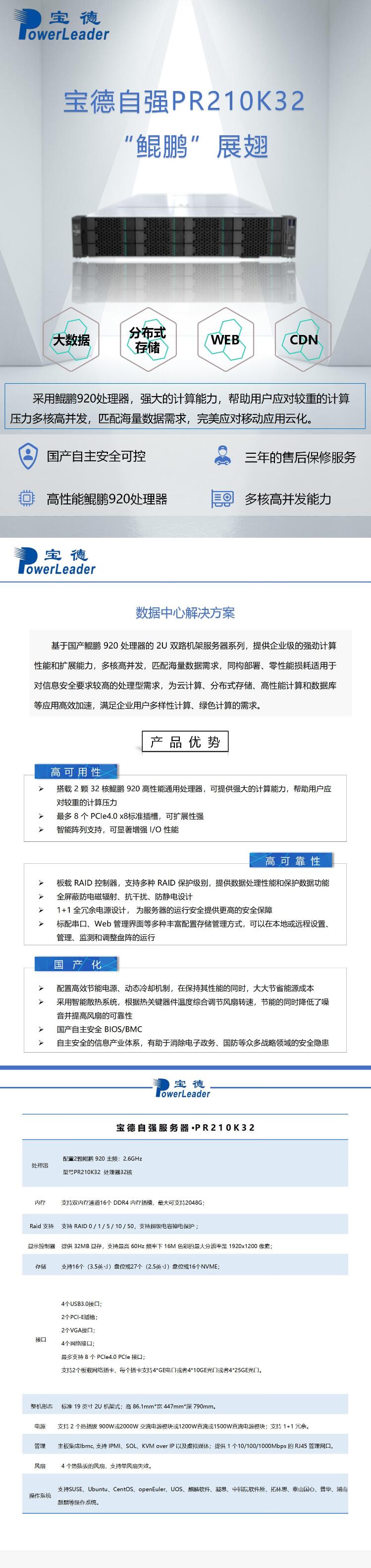 宝德PR210K32服务器(2*鲲鹏920/4*64GB/1*960GB SSD/3*4TB SATA HDD/RAID卡/1*IO模组/2*电源模块白金900W/1*硬盘转接支架/4*3.5英寸硬盘托架/1*2U静态滑轨)
