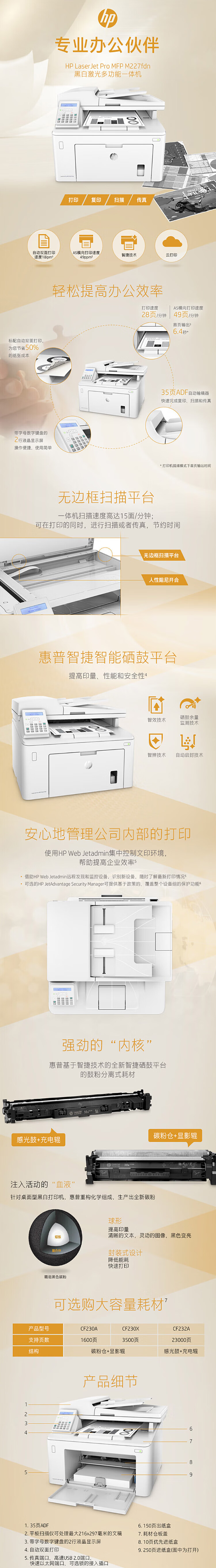 惠普(HP)LaserJet Pro MFP M227fdn A4激光多功能一体机 自动双面打印/复印/扫描/1年保修