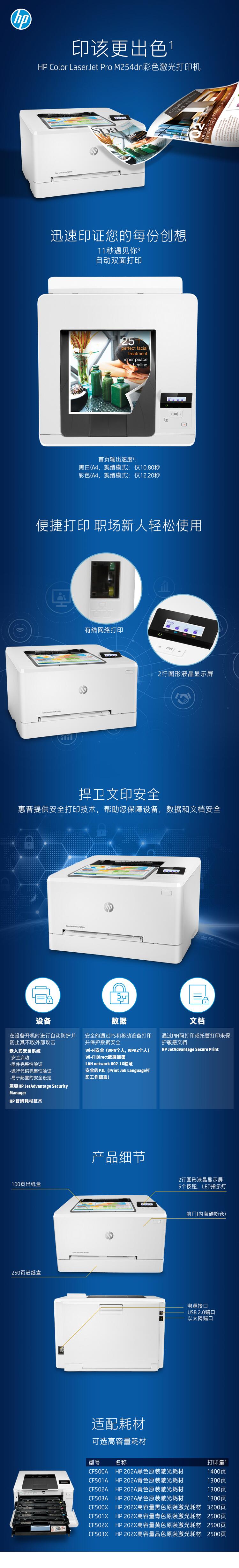 惠普(HP) Color LaserJet Pro M254dn A4彩色激光单功能打印机 自动双面打印