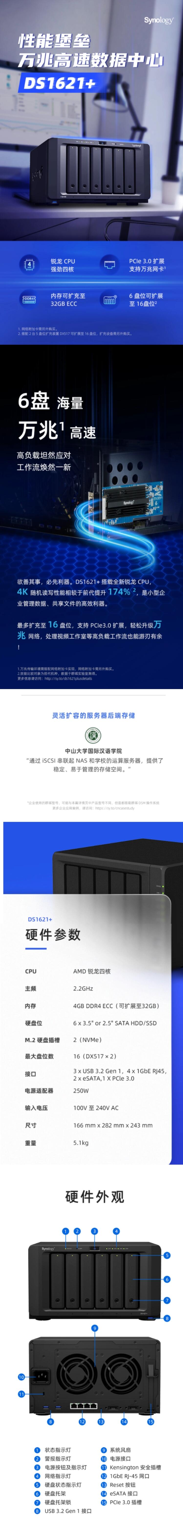 群晖(Synology)DS1621+ 服务器(搭配WD 16TB企业级硬盘*5个,质保三年)