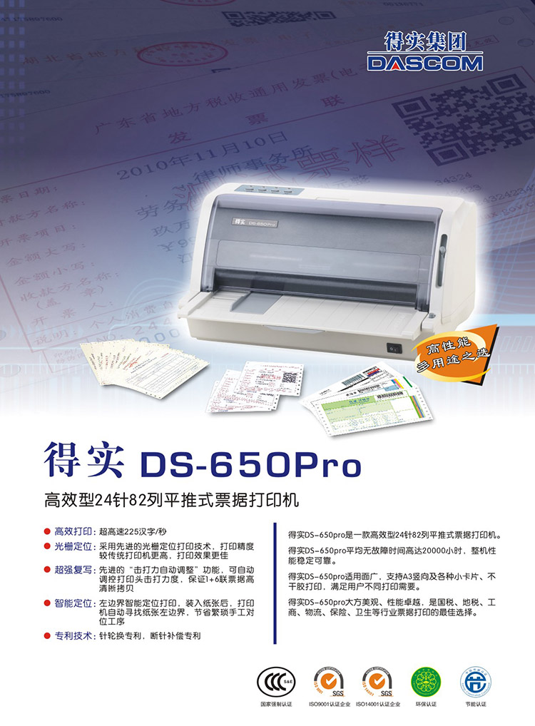 得实(Dascom)DS-650PRO 24针82列平推式票据打印机